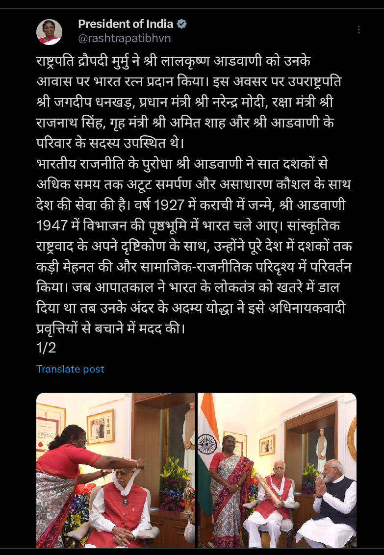 एक सांसद के रूप में संवाद पर उनकी आस्था ने संसदीय परंपराओं को समृद्ध किया। गृह मंत्री तथा उप प्रधान मंत्री के रूप में, उन्होंने सदैव राष्ट्र हित को सर्वोपरि रखा, जिससे उन्हें दलगत सीमाओं से परे जा कर लोगों ने सम्मान और प्रशंसा प्रदान की। भारत के सांस्कृतिक पुनरुत्थान के लिए उनके लंबे और अथक संघर्ष की परिणति 2024 में अयोध्या में श्री राम मंदिर के पुनर्निर्माण के रूप में हुई। वे स्वतंत्रता के बाद के उन गिने-चुने राजनीतिक नेताओं में हैं जो राष्ट्रीय प्राथमिकताओं को नया स्वरूप देने और देश को विकास-पथ पर आगे ले जाने में सफल रहे। उनकी उपलब्धियाँ भारत की सहज प्रतिभा और समावेशी परंपराओं को सर्वोत्तम अभिव्यक्ति प्रदान करती हैं।“महामहिम राष्ट्रपति द्रौपदी मुर्मू का ट्वीट”