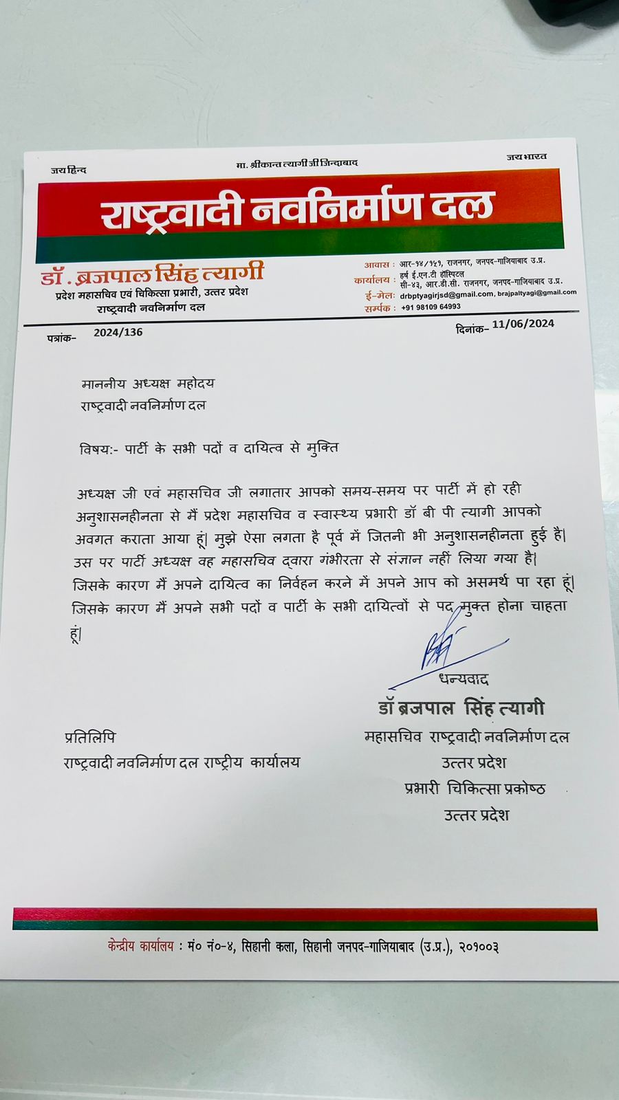 “पार्टी में अनुशासनहीनता, मैं डॉ० बी०पी० त्यागी अपने सभी पदो से रास्ट्र वादी नव निर्माण दल से त्यागपत्र देता हूं”