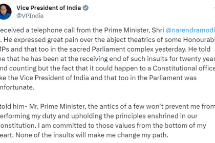 BPC न्यूज़ ब्यूरो -: उपराष्ट्रपति जगदीप धनकड़ ने एक ट्वीट करते हुए प्रधानमंत्री नरेंद्र मोदी से हुए संवाद को सांझा किया प्रधानमंत्री श्री नरेंद्रमोदी जी का टेलीफोन कॉल प्राप्त हुआ।…