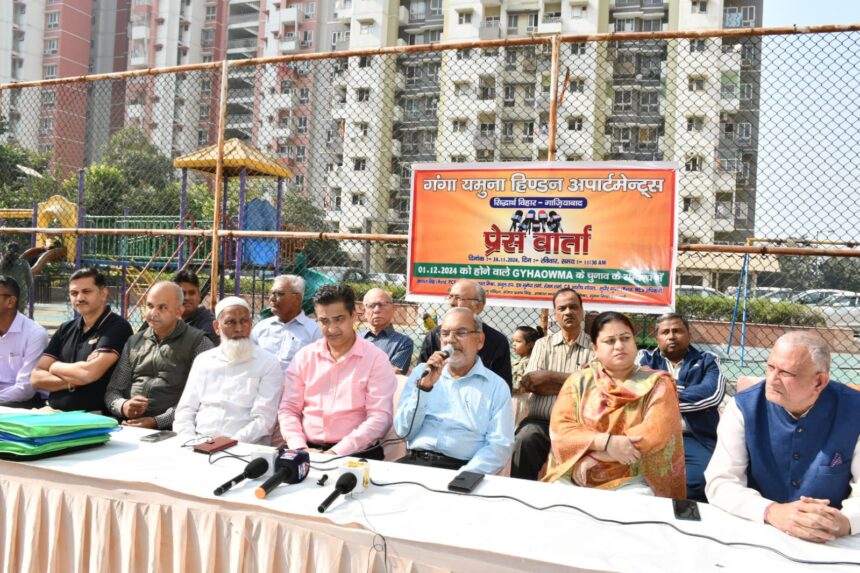 गाजियाबाद (सुमन मिश्रा) गंगा यमुना हिंडन अपार्टमेंट सिद्धार्थ विहार के निवासी रक्षपाल सिंह (Retd PCS अधिकारी), अचल मिश्रा, अतुल राय, डॉ सुमेधा शर्मा, रंजन शर्मा, CA आशीष गोयल, सुधीर गुप्ता (Retd. MES अधिकारी), एकता शुक्ला, S C शर्मा, देवेंद्र कुमार, अमित मिश्रा, खलीक अंसारी, M R वशिष्ठ, M M पांडेय, शांतनु पंडित द्वारा एक प्रेस वार्ता गंगा यमुना हिंडन अपार्टमेंट ओनर्स वेलफेयर मेंटेनेंस एसोसिएशन के आगामी 1 दिसंबर 2024 को होने वाले चुनावो के संदर्भ में रखी गई है ।