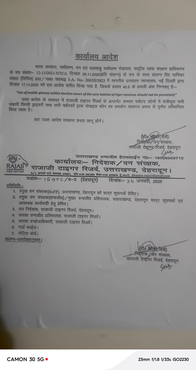 देहरादून: Supreme Court of India ने जंगल सफारी के दौरान मोबाइल फोन के उपयोग पर सख्त रोक लगाने का आदेश दिया है। इस फैसले के तहत अब पर्यटक और ड्राइवर दोनों को जंगल के अंदर मोबाइल फोन ले जाने की अनुमति नहीं होगी। सफारी शुरू होने से पहले उन्हें अपने फोन निर्धारित स्थान पर जमा कराने होंगे।